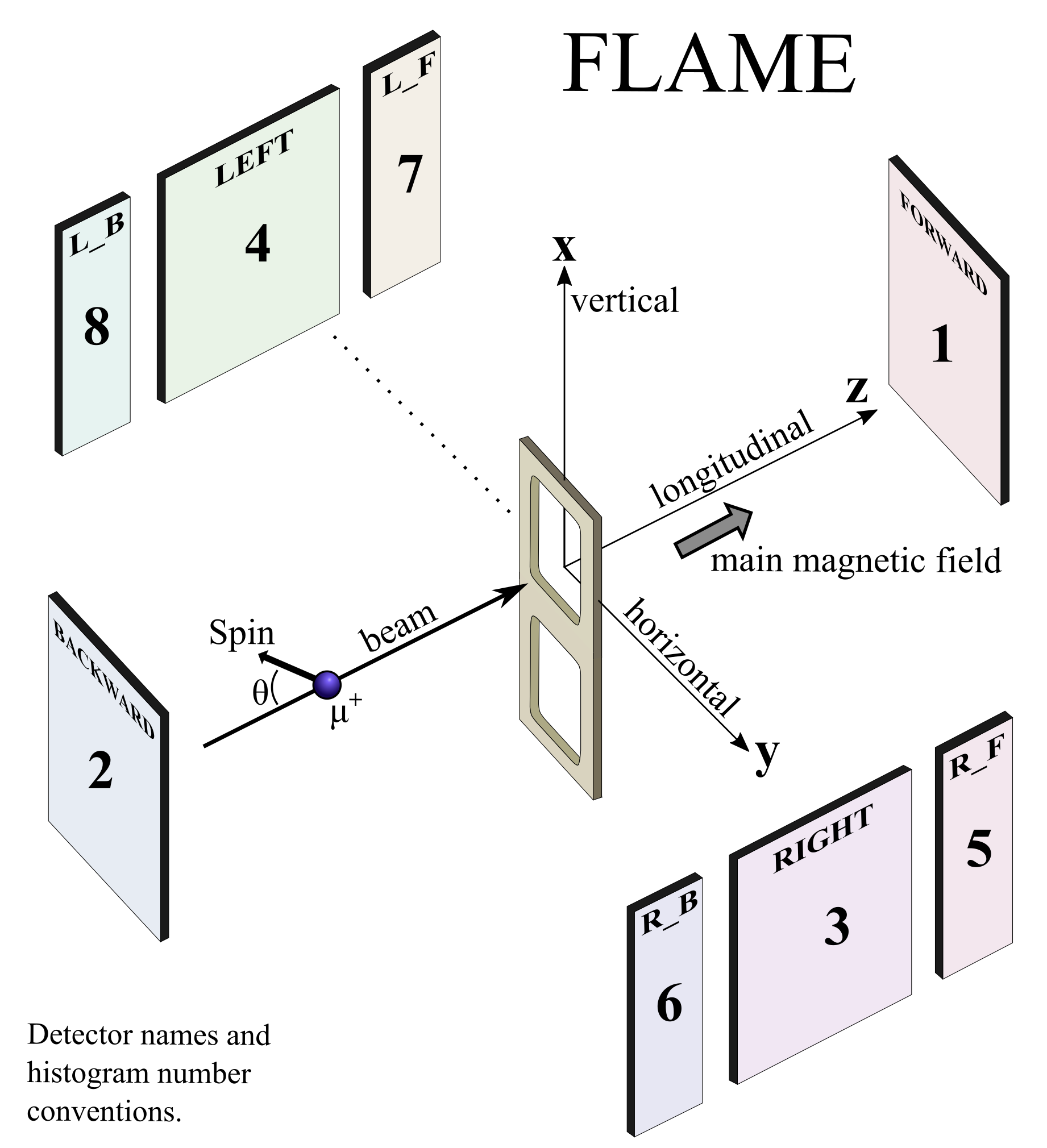 So far, we have only looked at opposite detector pairs. However, the Flame detector set is segmented, and if we want, we can add histograms from different detectors together. In particular, we can add Right_Backward and Left_Backward to Backward, and Right_Forward and Left_Forward to Forward. As you can see in the spectrometer schematic below, the corresponding histogram numbers are 6+8+2 and 5+7+1 .